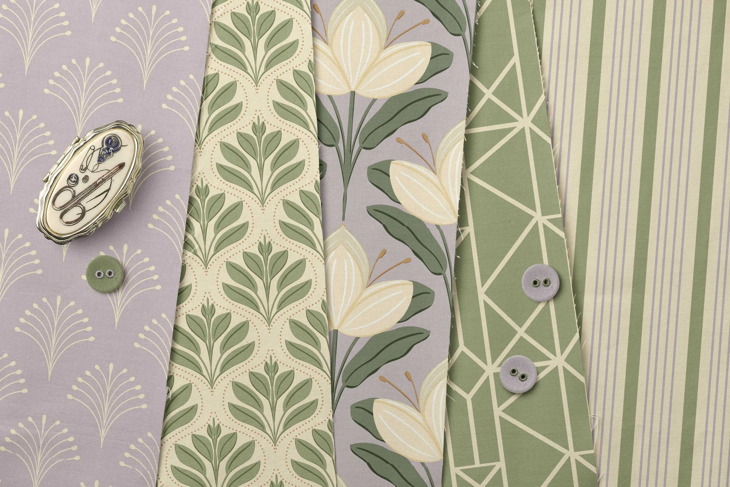 With coordinating designs ranging from botanical repeats to stripes and geometric layouts, the collection is designed for effortless mixing across wallpaper, home decor, and stationery. A muted palette of sage green, lavender purple, cream, and taupe adds a calm, elevated finish.